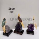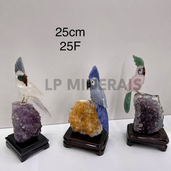 Wunderschöne handgefertigte Edelstein-Vogelfigur auf einem natürlichen Drusen-Sockel. Jedes Stück besticht durch lebendige Farben und feine Details und ist somit ein einzigartiges Dekorationsstück. Höhe: ca. 25 cm.